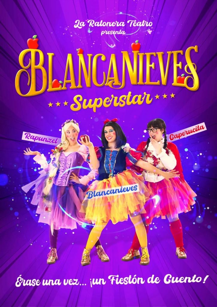 Blanca Nieves Superstar, es un show musical divertido, interactivo y lleno de energía para disfrutar en familia. Blancanieves, Rapunzel y Caperucita Roja se suben al escenario en un espetáculo con canciones en directo, audiovisuales espectaculares y un montán de participación del público. ¡Los peques alucinan y los mayores también!